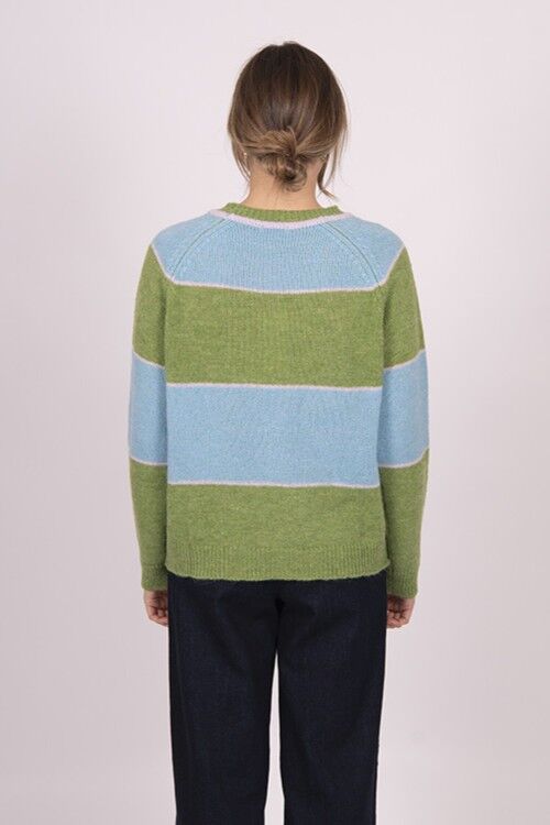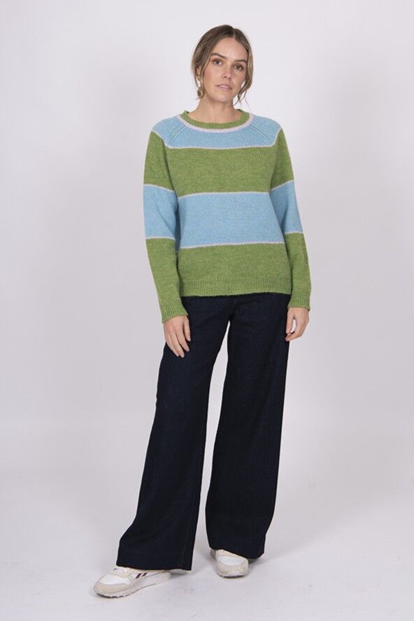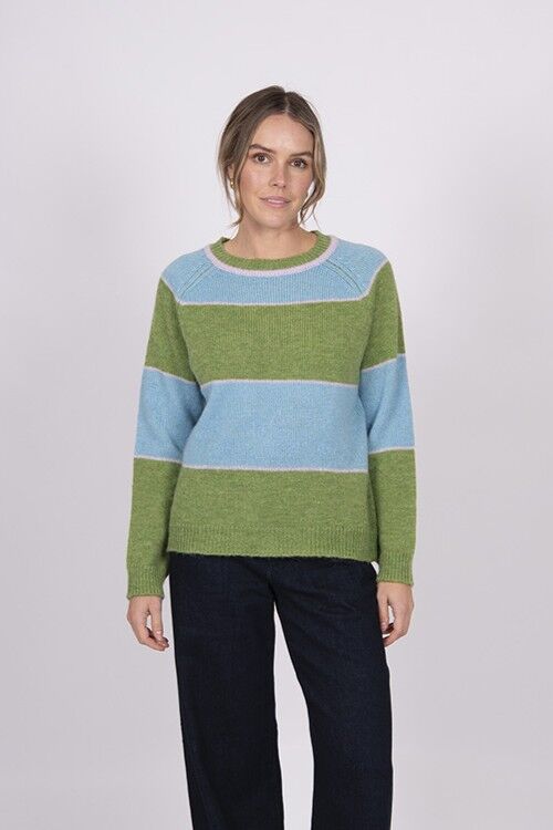 This stylish block stripe pullover is a custom-knitted design made from a soft and supple mohair wool blend with a relaxed boxy shape. Featuring wide block stripes, raglan sleeves, and a crew neckline