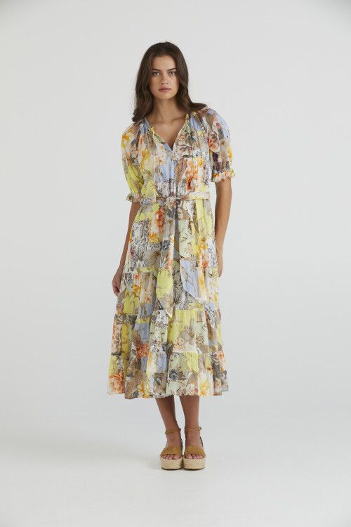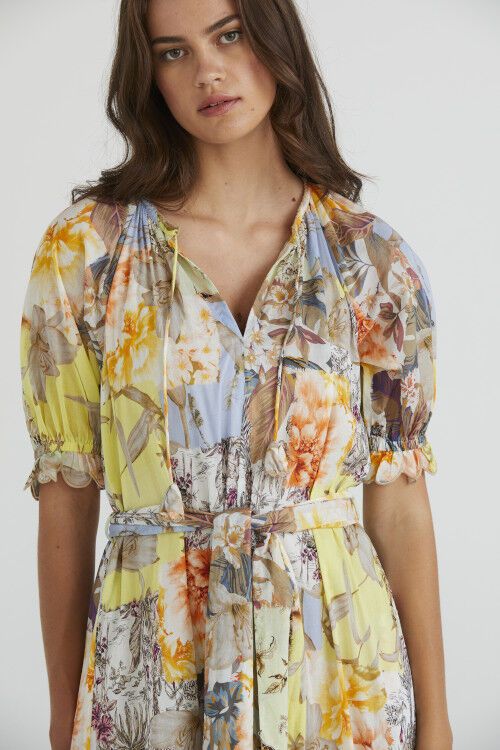 Experience the enchanting allure of the Monarch Dress, a lightweight cotton dress adorned with the captivating Monarch patchwork print. Delicate scallop embroidery in light tan at the sleeve cuff and looped cotton embroidery at the neckline add an artisanal touch, and crochet trimmed tulip tassel edges provide a playful finish. Elasticated at the back waist for a comfortable fit, this dress includes a removable fabric belt for effortless styling options.  100% cotton