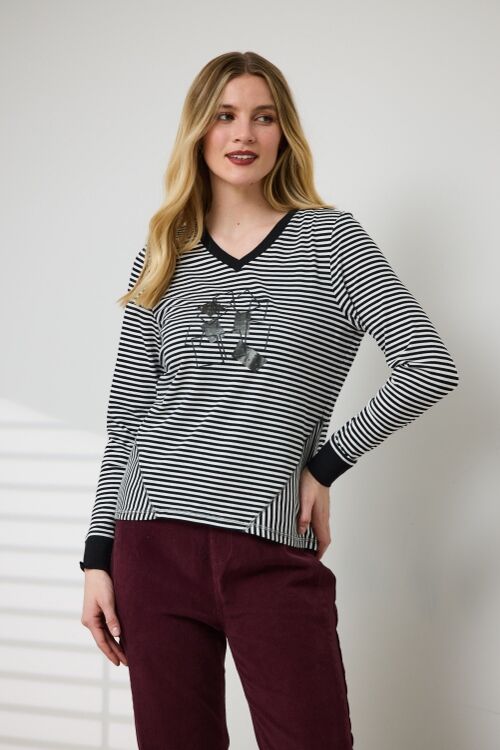 V-neck standard fit stretch top. Front placement print. Stripe body and sleeves with plain contrast neck band & sleeve cuffs. Side godet panels with stripe cut vertical. 95% cotton, 5% elastane single jersey yarn-dyed stripe
