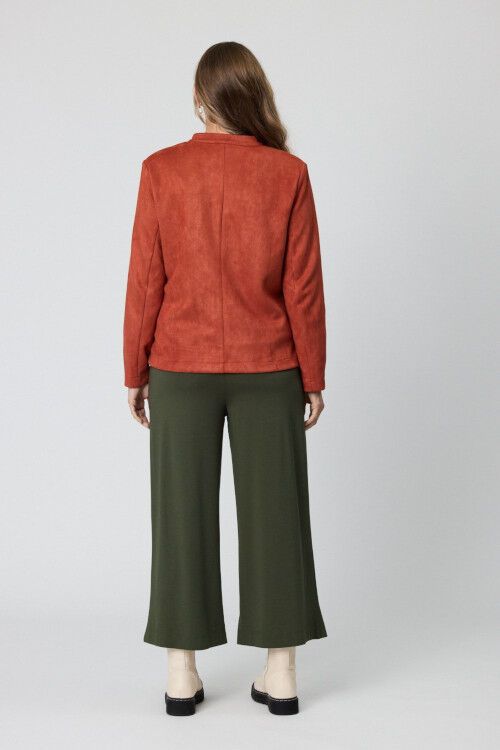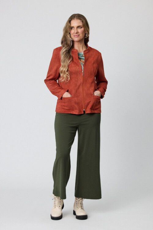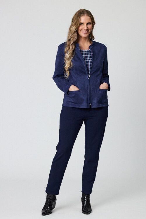 Zip front jacket in a comfortable stretch suedette. Small stand up collar and front pockets.  92% polyester suedette, 8% elastane