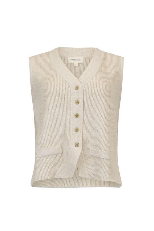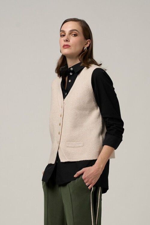 Fitted vest with button down front and jet pockets, in all over rib. Perfect for layering. 97% polyester, 3% spandex