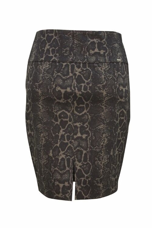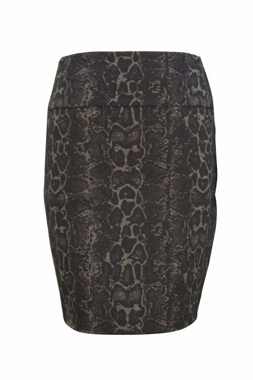 Up! Skirt - luxury collection ‘Snake’ print. Stylish, zip free pull-on stretch skirt in exquisite two tone print. Medium deep waistband with 3" interior control lining at the front for support and comfort over the tummy. Slim fit to the knee. Waistband 2 3/4". 51% Polyester, 45% Rayon, 4% Spandex.