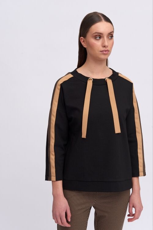 Black top in soft knit fabric. Round neckline with decorative beige ribbons. Long sleeves with printed ribbon detail and plain beige ribbon. Relaxed fit and straight hem. Designed and manufactured in Spain. 65% viscose, 32% nylon, 3% elastane