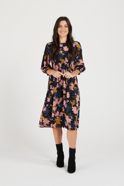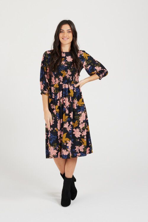 3/4 sleeve midi dress with shirring at the bust in floral print. Outer: 100% polyester; Lining: 100% cotton