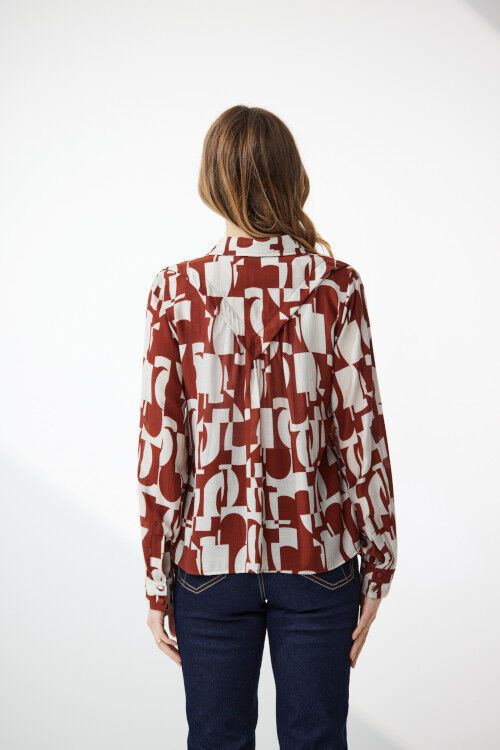 Crafted from a soft viscose blend fabric, this button-front collared shirt features a chic geometric print that is both eye-catching and versatile. The button cuffs come with a stylish pleat detail, adding a touch of sophistication to your look. The angled pleat at the back bodice not only enhances the style but also gives it a unique flair. 81% viscose, 19% nylon