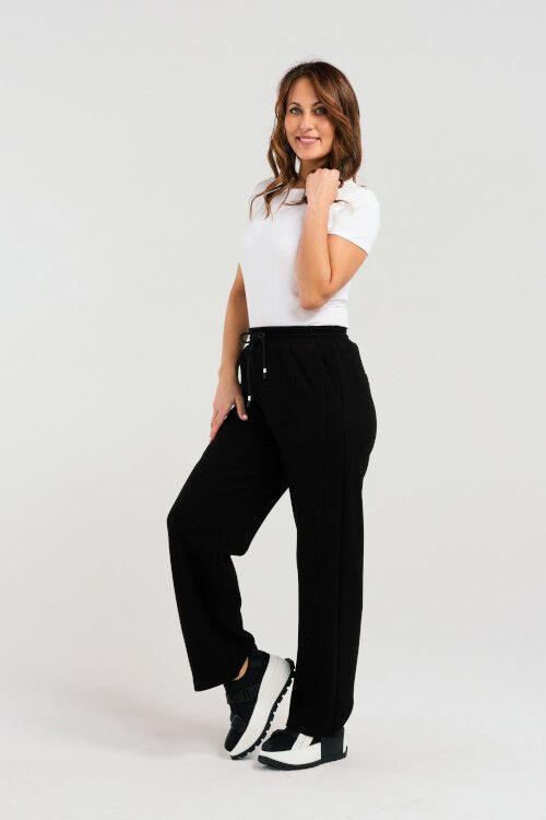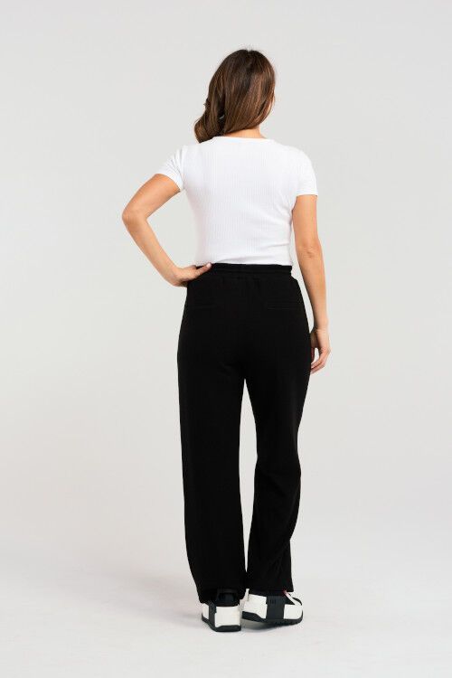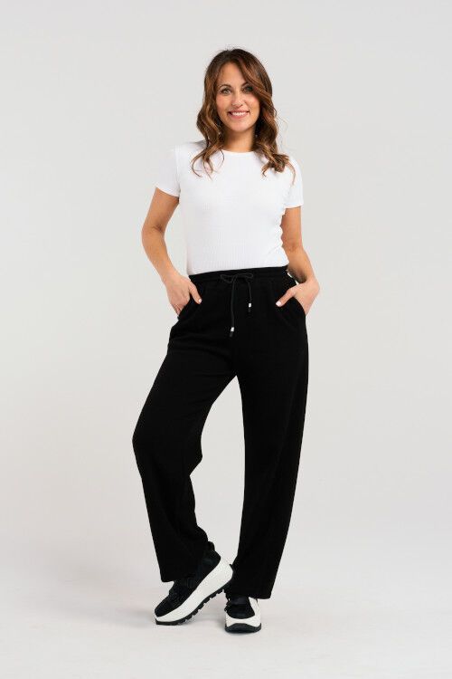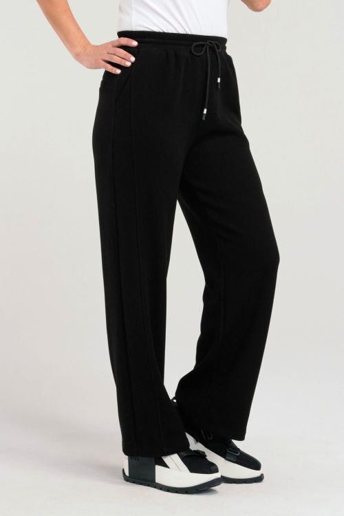 These black pants feature an elasticated waist with a drawstring for an adjustable, comfortable fit. With practical pockets, they combine style and convenience effortlessly. 38% rayon, 35% nylon, 23% polyester, 4% spandex