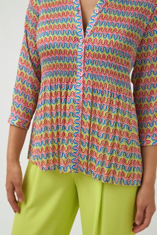 Flowy pleated top in a colourful geometric print. V neckline and front closure with mother of pearl buttons. 3/4 sleeves with buttoned cuffs. Designed and manufactured in Spain. 100% polyester