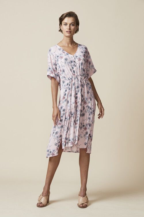 Delicate poppy print georgette dress with adjustable drawstring detail at the front waist, gathering, and button front placket.  The perfect spring occasion dress.  100% viscose