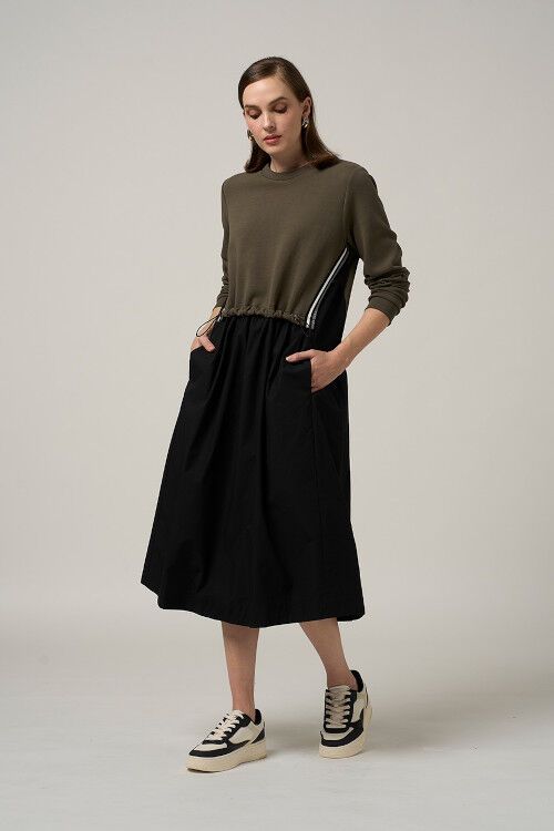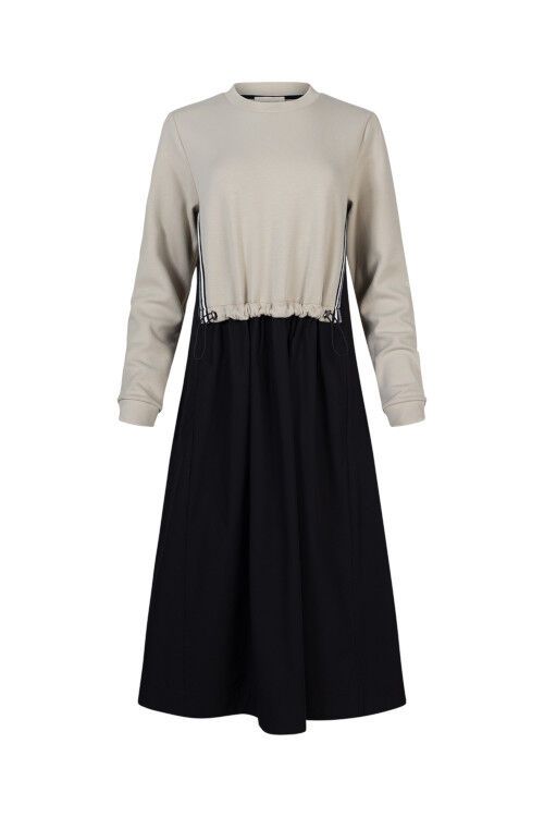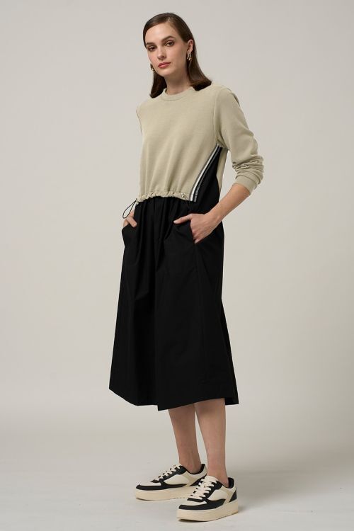 Crew neck sweatshirt dress, with poplin skirt. Featuring striped contrast knit at side and armhole seams. 84% cotton, 12% polyester, 4% spandex/100% cotton