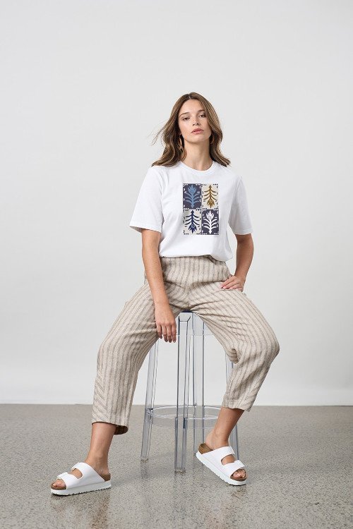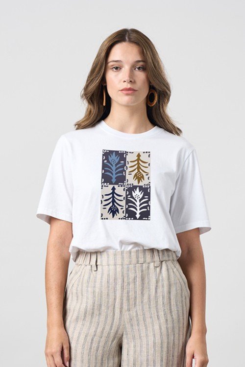 Easy fitting jersey tee with custom placement print. With an A-line shape and side splits this would be a versatile addition to a summer wardrobe. 100% cotton