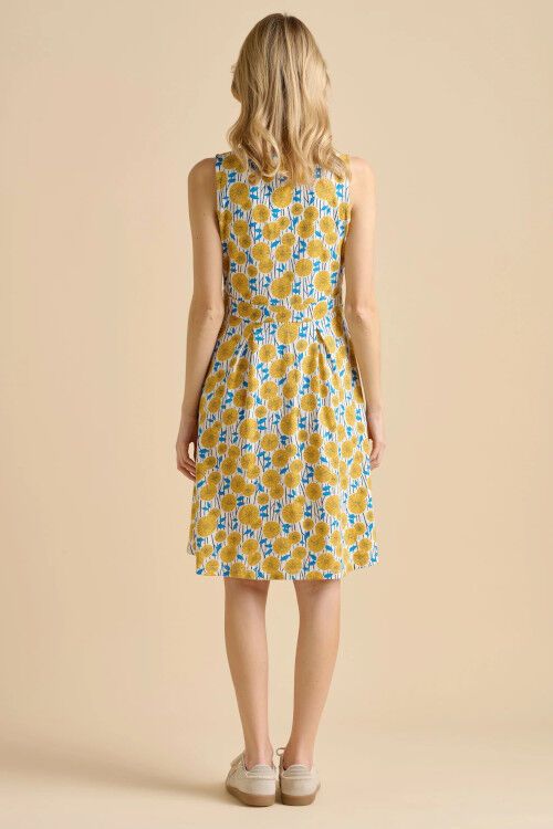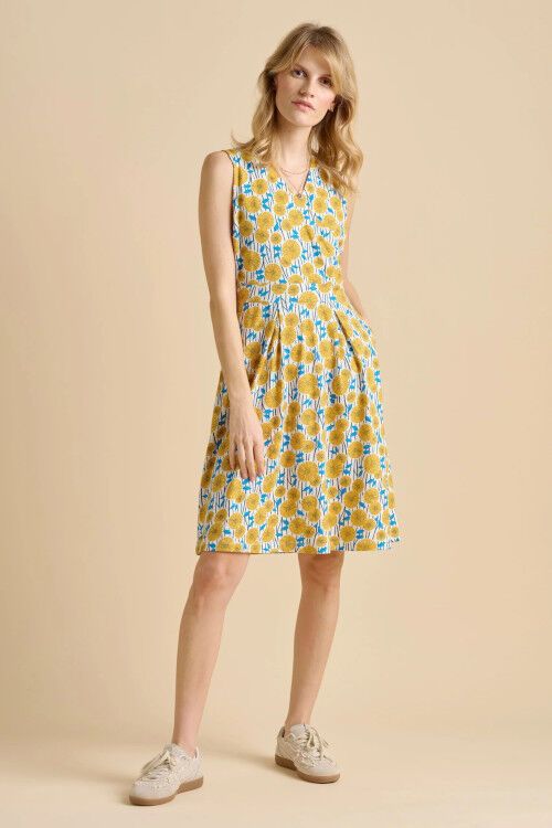 Brighten up your wardrobe with this stunning yellow dress featuring a cross-over neckline and an eye-catching pattern. Sleeveless and knee length. 100% cotton