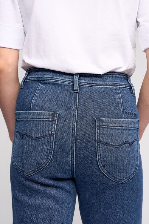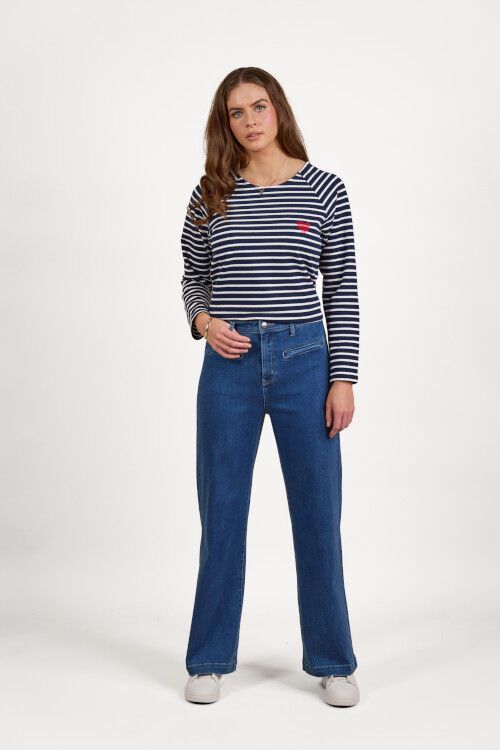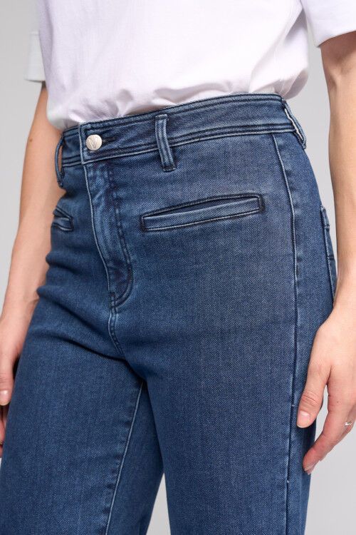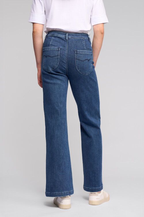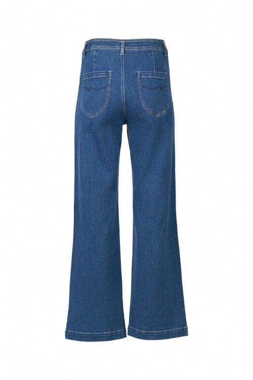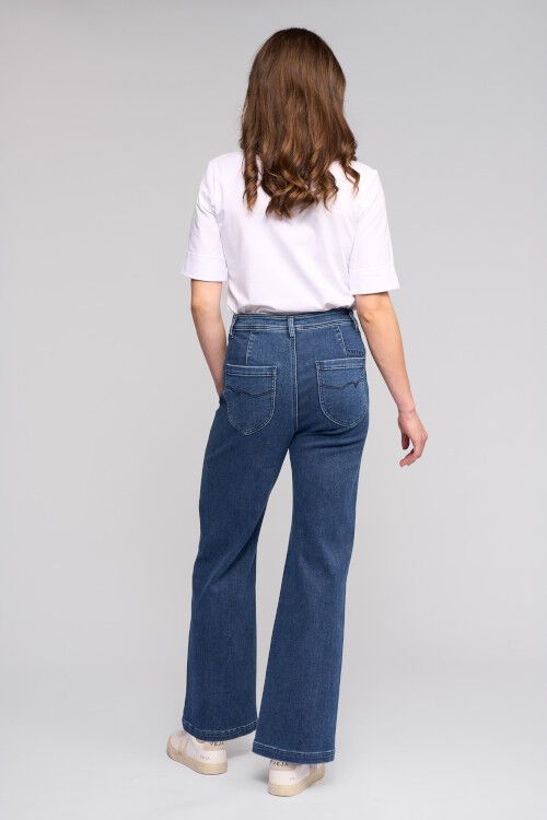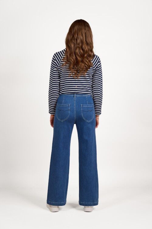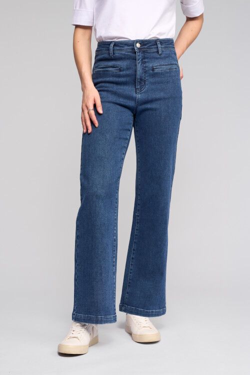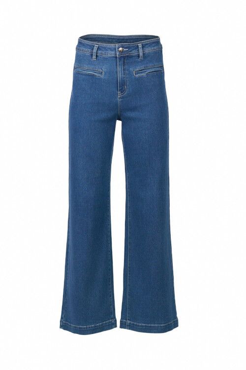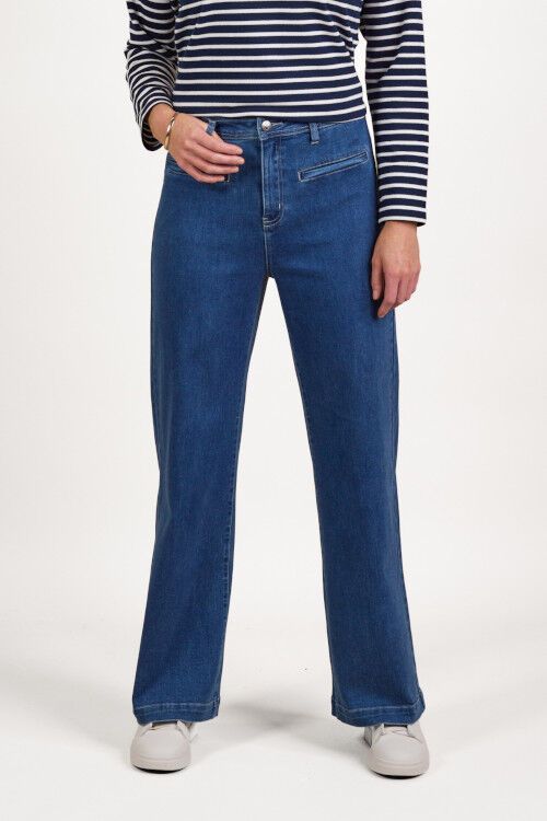 Wide-leg full-length jean - a classic blue denim with a softly brushed interior for added warmth. Designed with front welt pockets and a modern, relaxed silhouette, this style offers a contemporary take on everyday denim. 60% cotton, 38% polyester, 2% elastane