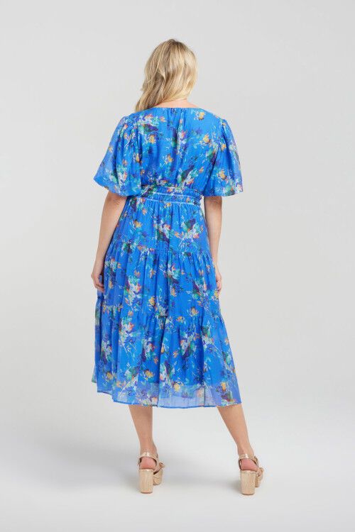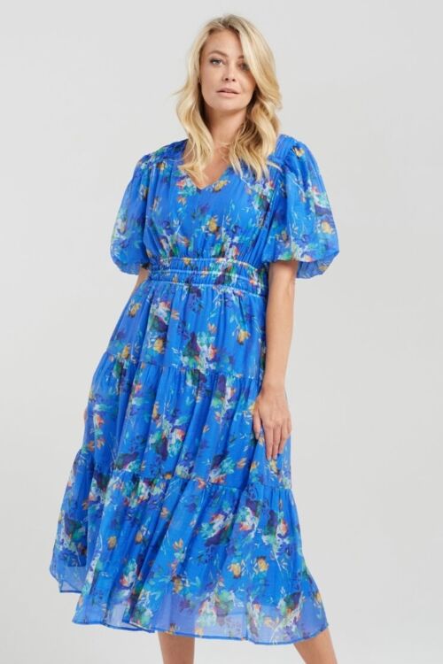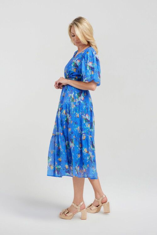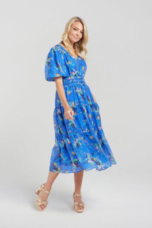 An effortlessly chic dress in a vibrant blue floral print, designed to brighten any occasion. The elasticated waistline ensures a comfortable and flattering fit, allowing for easy movement. With a tiered skirt that adds playful movement and a touch of whimsy, this dress exudes feminine charm. Voluminous short sleeves further enhance its relaxed yet stylish silhouette.  85% rayon, 15% nylon; lining 100% rayon