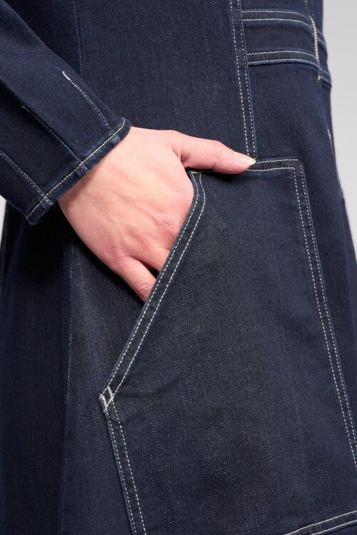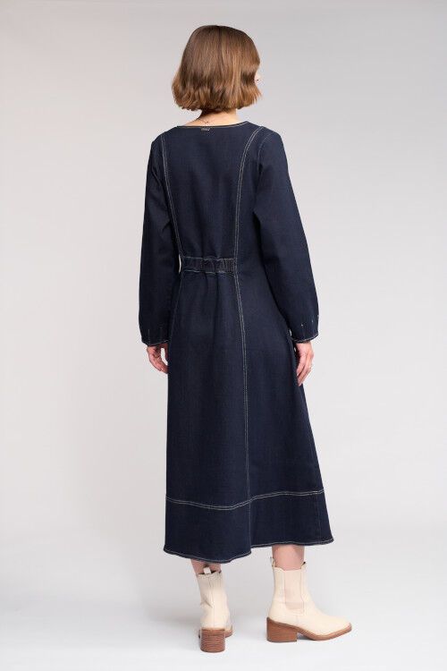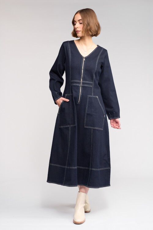 Long sleeve denim dress crafted from heavyweight Ink Denim, a dark blue denim. Featuring a V-neckline with a functional front zip opening to the waist, this style combines tailored seam detailing with contrast topstitching to highlight the shape and construction of the dress. Finished with angled front patch pockets and subtle elasticated shaping through the back waist.  97% cotton, 3% elastane