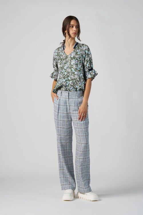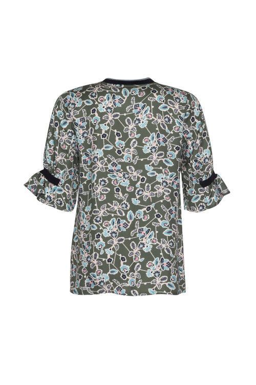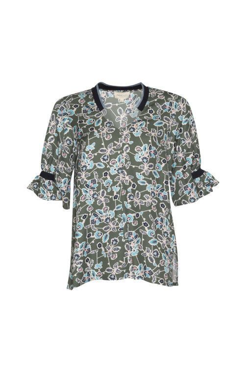 Relaxed fitting V-neck top, featuring sleeve panels partially gathered onto a contrast rib insert with contrast rib also inserted at the nickline. 95% tencel, 5% linen