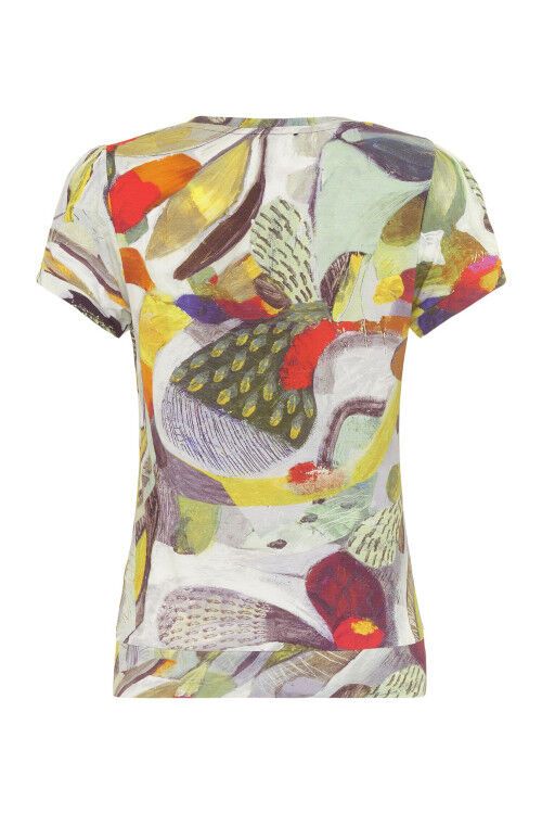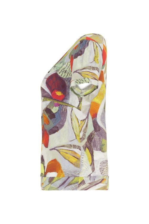 Simply Art by Dolcezza - "Botanica" by artist Este Macleod, UK. The bright print features colourful prints in an abstract garden design. There is slight gathering at the neckline, a band at the hem to give some shape and short sleeves with a little shoulder gathering. Lightweight stretchy fabric in a comfortable fit. 95% modal, 5% elastane