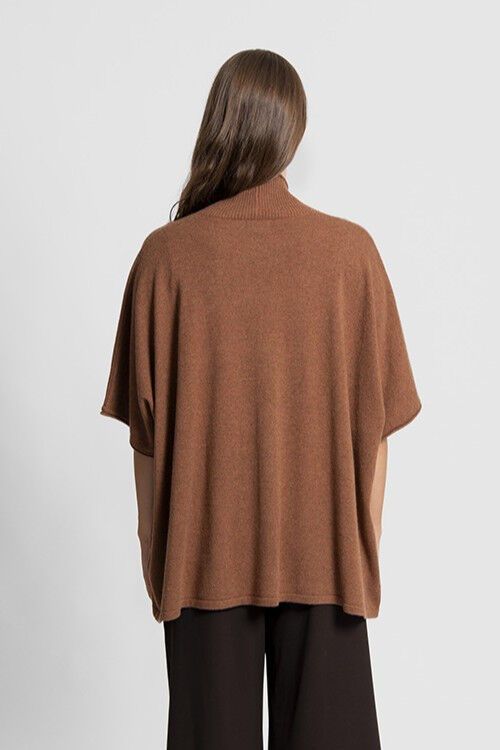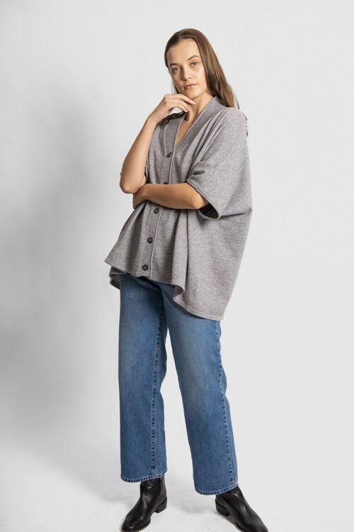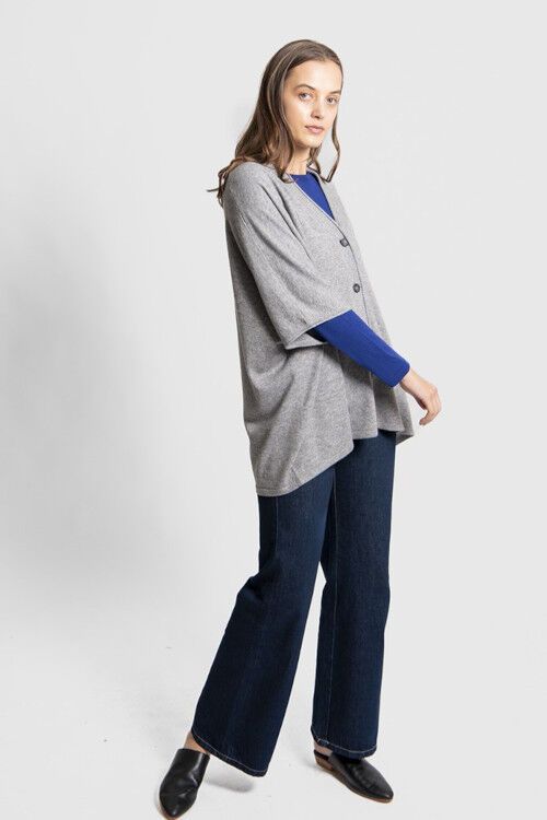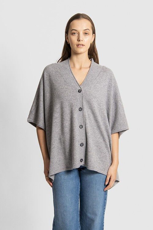 A versatile throw-over poncho type garment that can be buttoned or left open. 47% superfine merino wool, 38% viscose, 10% nylon, 5% cashmere