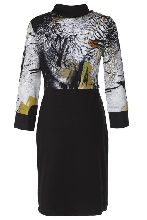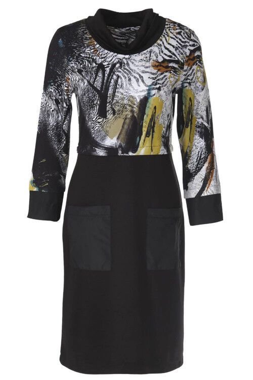 Simply Art by Dolcezza “Safari Escape” by Turkish artist Azize Ickan. The Safari Escape print features on the front and back top with plain black cowl neck, skirt and cuffs. Two patch pockets are a feature on the front. 70% cotton, 25% polyester, 5% elastane