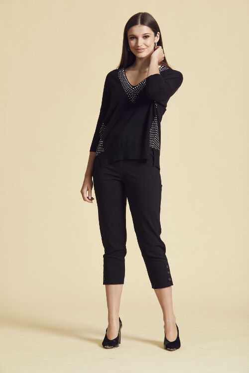 A lightweight, slim leg, detail button placket, 3/4 pant. Perfect summer casual wear. 60% viscose, 36% nylon, 4% elastane