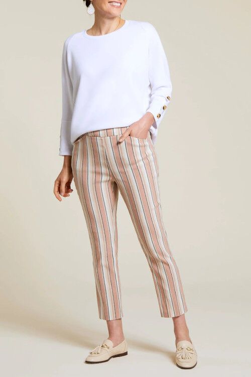 Pull-on slim leg capri with front pockets in a super stretchy yarn-dye striped print fabric. 75% polyester, 22% nylon, 3% spandex