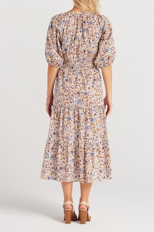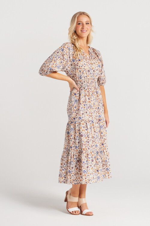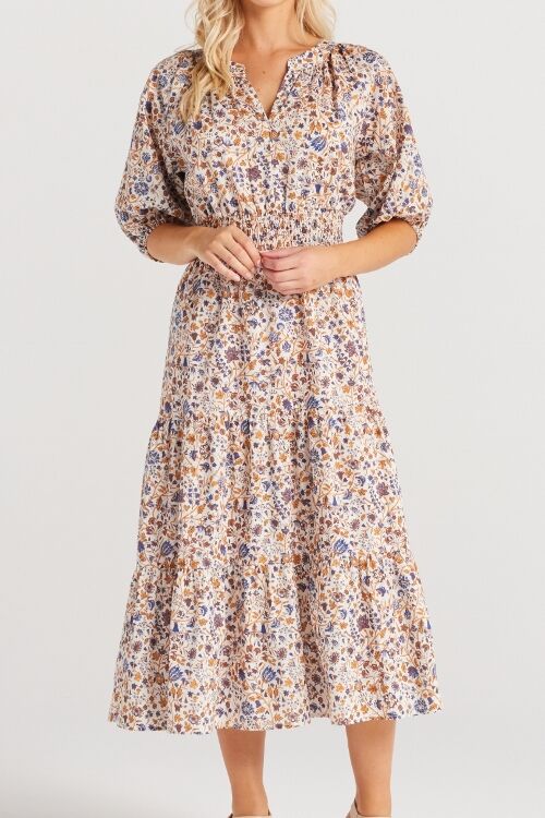 Graceful V-neckline, button-up front, elasticated mid-length sleeves, a shirred waist for perfect fit and three beautifully draped skirt panels. 100% cotton