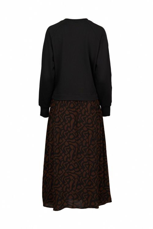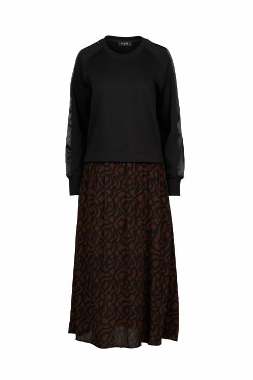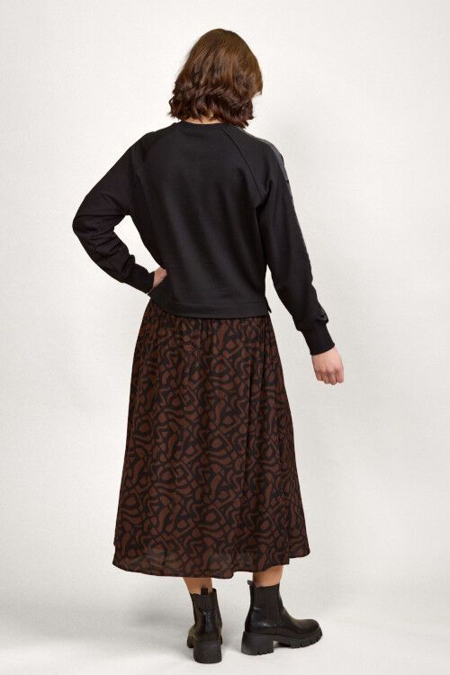 The Rebel dress has a knit jersey bodice and woven printed mid length skirt with small side split detail. Round neck line with rib trim, long raglan sleeves with satin trim down the side and a rib cuff, unlined. Inseam pockets and a relaxed fit.  Main: 100% cotton; Trim: 39% viscose, 61% rayon