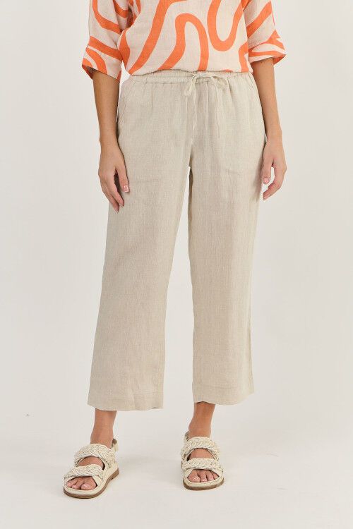 Relaxed fitting, ankle length pant with elastic waist with drawstring and deep side pockets. 100% linen