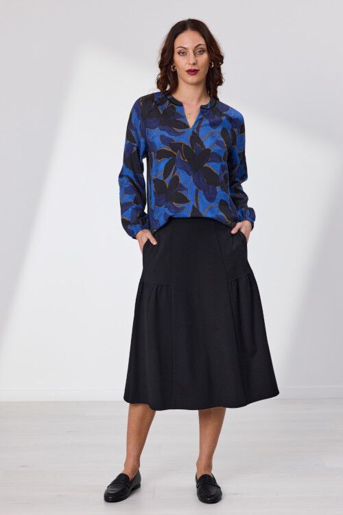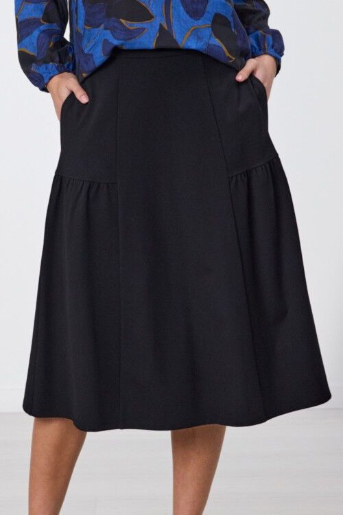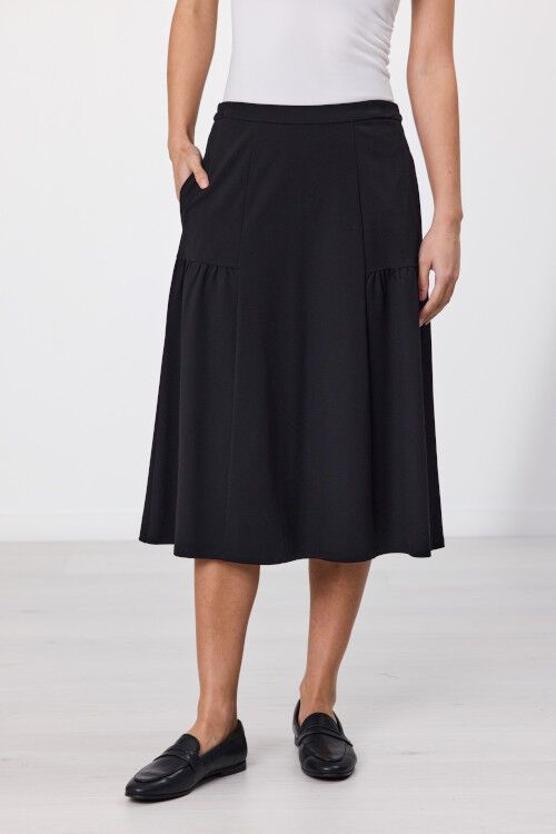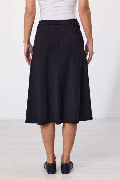 Effortlessly stylish and easy to wear, this pull-on skirt features a flat front with an elasticated back for a comfortable fit. Crafted with gathered panels at the front that create a soft flared silhouette, it moves beautifully with every step. It’s perfect for pairing with everything from casual tees to polished blouses.  55% viscose, 30% nylon, 10% elastane, 5% tencel