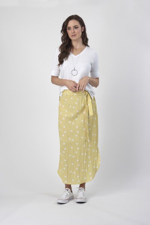 Light summer skirt with lovely curved hemline and detachable tie belt. 75% rayon, 25% nylon
