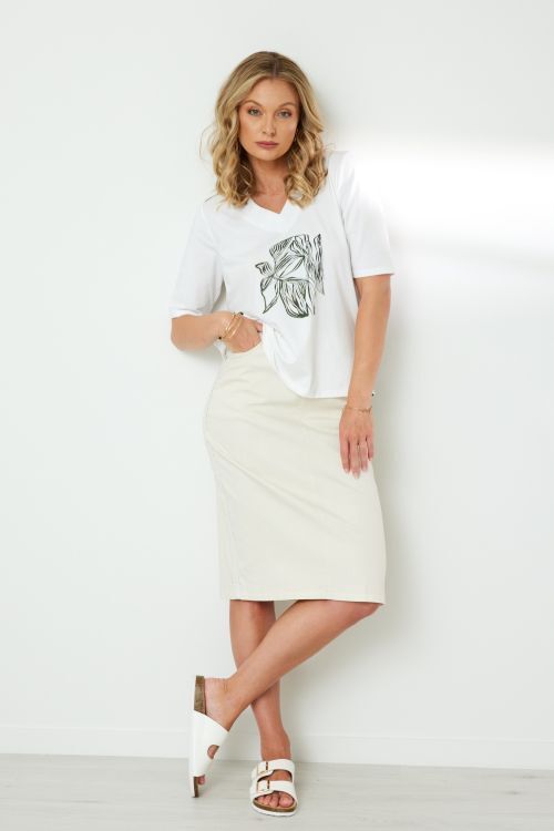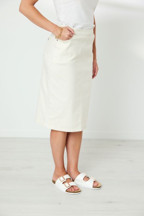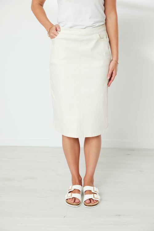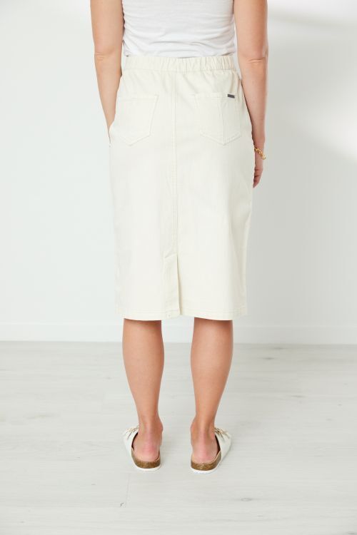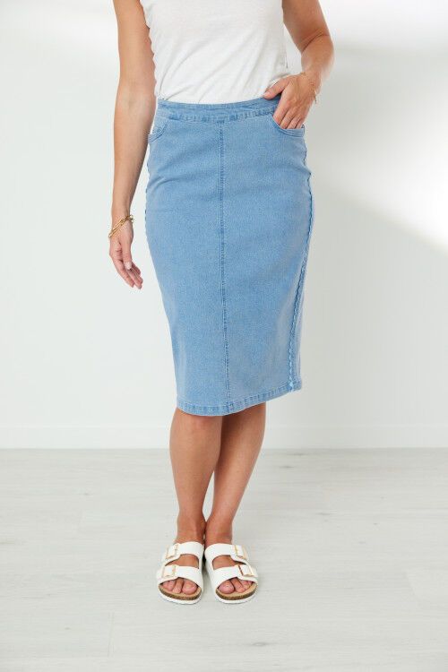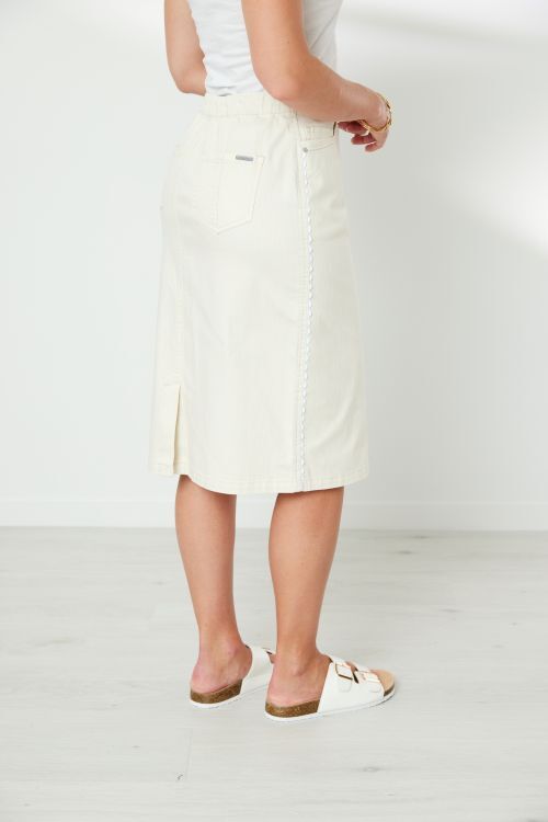 Knee length, pull on skirt with flat front, elasticated back waistband. 5 pocket styling. Contrast ric rac trim at side seam. Back hem split.  72% cotton, 26% polyester, 2% elastane