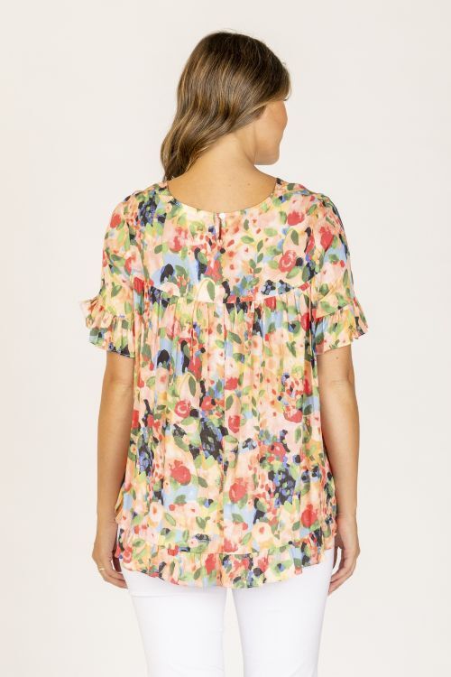 Round neck loose fitting cotton top with ruffle hem and cuffs. The back is gathered into a circular yoke which gives the style a lovely floaty look. 100% cotton