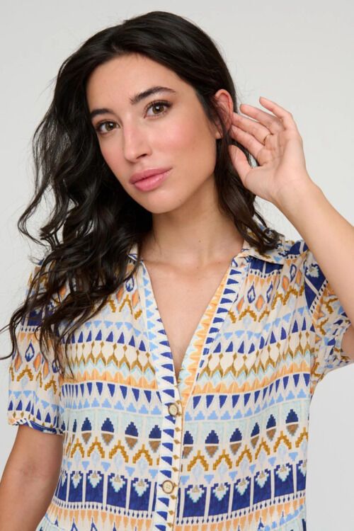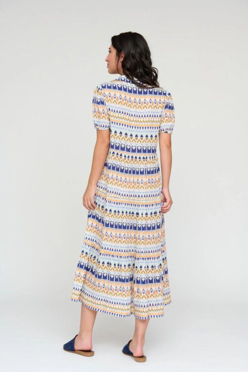Printed midi dress. Fluid, soft and light fabric. Shirt collar. Front closure to the hem with mother-of-pearl effect buttons. Short sleeves with elastic cuffs. Flowing skirt with two gathered cuts to provide movement. Straight hem. Designed and manufactured in Spain. 100% viscose