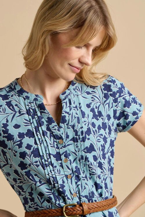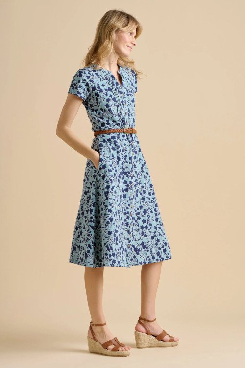 Below-the-knee A-line dress with notched V neckline and small wooden buttons and feature pintucks to the waist. 100% cotton