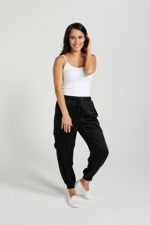 Trackie/Jogger styled casual pant. Tie waist. Cargo pocket detailing. Slight sheen fabric to transfrom into a smart casual look. Cuff hem. 50% acetate, 50% rayon