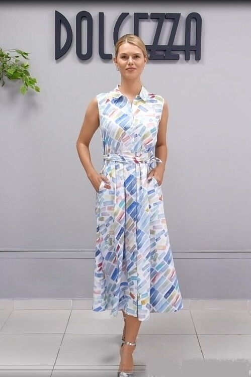 Simply Art by Dolcezza - a lovely shirt dress in a print from the painting "Group Think" by Megan Meagher. Collar and buttons down the front, self tie at the waist and an 'above the ankle' length. 96% cotton, 4% elastane