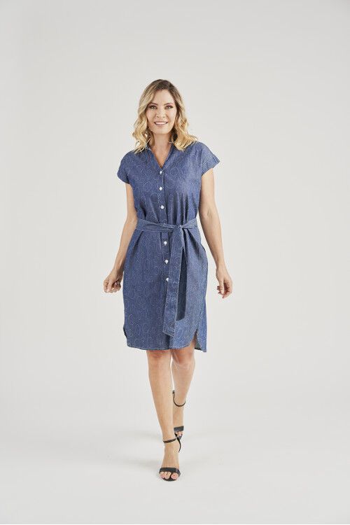 A dress for those who like a collar. Button front and optinal tie belt. 100% cotton jacquard denim