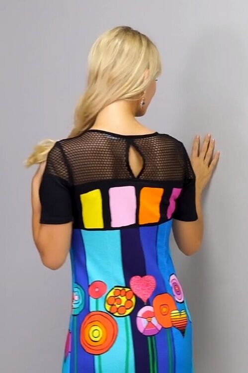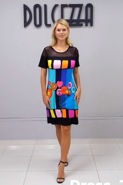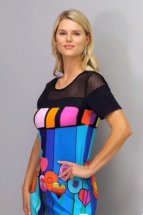 Simply Art by Dolcezza - a colourful dress in a print from the painting "Happiness" by Dora Ficher. Print front and back with black sleeves and hem panel, black mesh across the top and sleeves. Keyhole opening in the back mesh. 95% cotton, 5% elastane