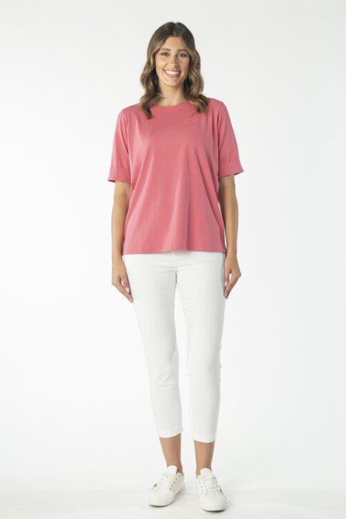 Round neck tee with a good length sleeve. Relaxed fit. Cotton/spandex