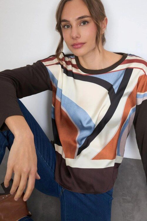 Long sleeved top with siky print front and complementary dark chocolate sleeves and back. Designed and manufactured in Spain. 57% viscose, 40% polyester, 3% elastane.