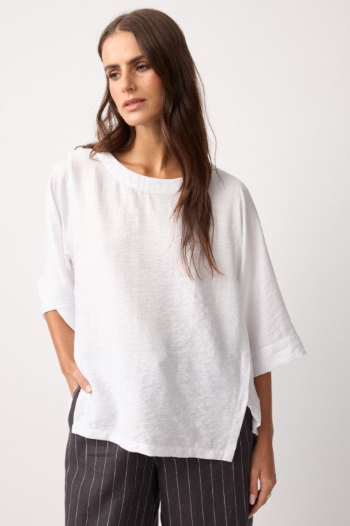 Wrap hem top with round neck and elbow length sleeves. 85% viscose, 15% nylon