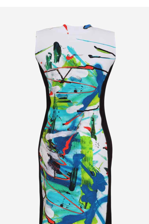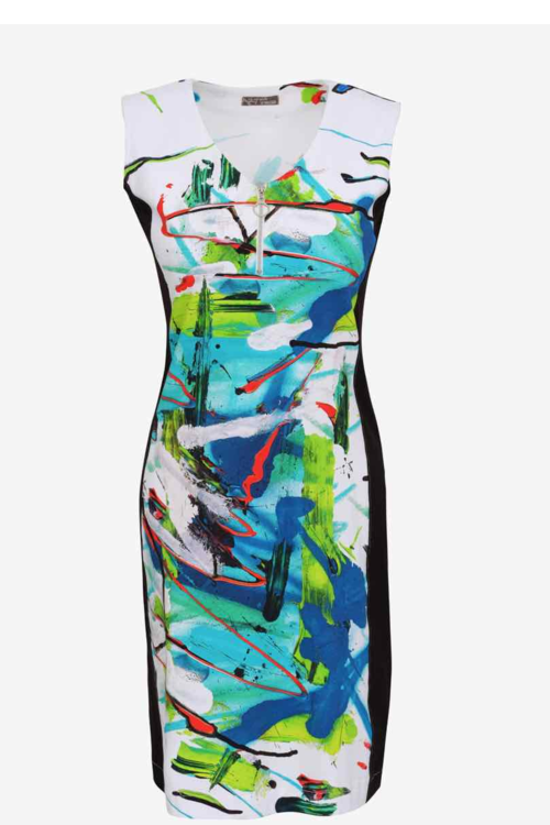 Simply Art by Dolcezza - a colourful dress in a print from the painting "River of Life" by Greek artist Aristotelis Deligiannidis. Side black panels on this style provide a most flattering fit and the slightly rounded V neckline is always a winner. Short zip and under the bust seam complete the look. 95% cotton, 5% elastane