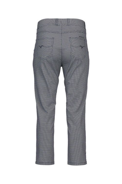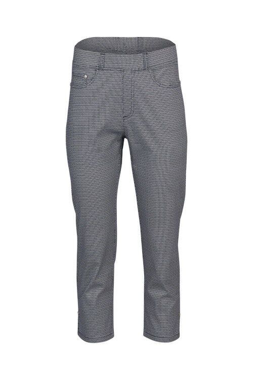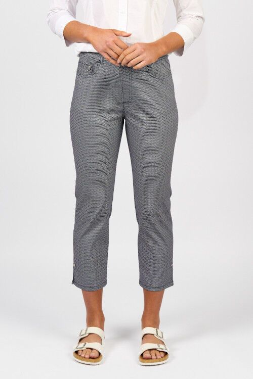 Elastic waist pant with belt loops, faux fly front, two front cut away pockets, two back patch pockets and side splits. Comfortable stretch fabric. 97% cotton, 3% elastane