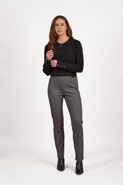 Slim leg full length knit pull on pant made from a comfortable stretch fabric for perfect fit. Pintuck centre front seam and elastic waistband. 40% rayon, 57% polyester, 3% elastane