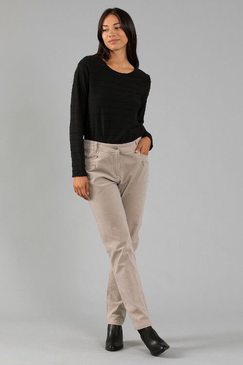 Fine stretch cord in a slim leg jean style with zip fly, zip trim front pockets and back pockets. 98% cotton, 2% elastane