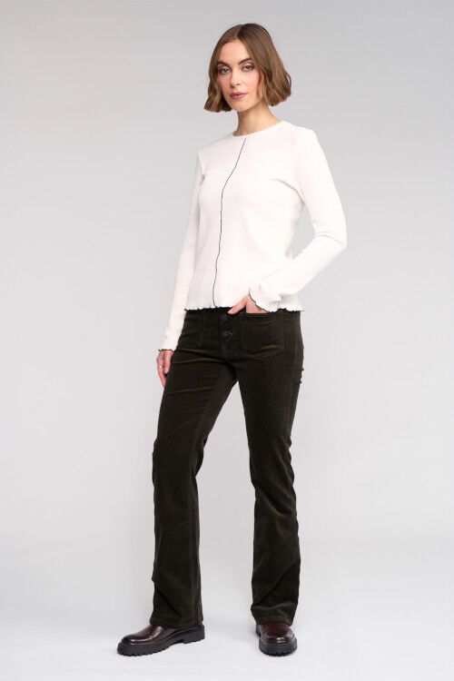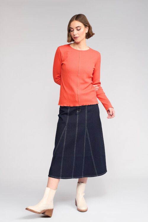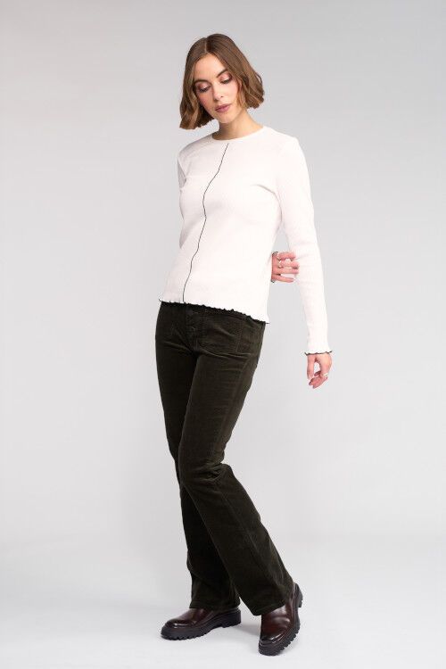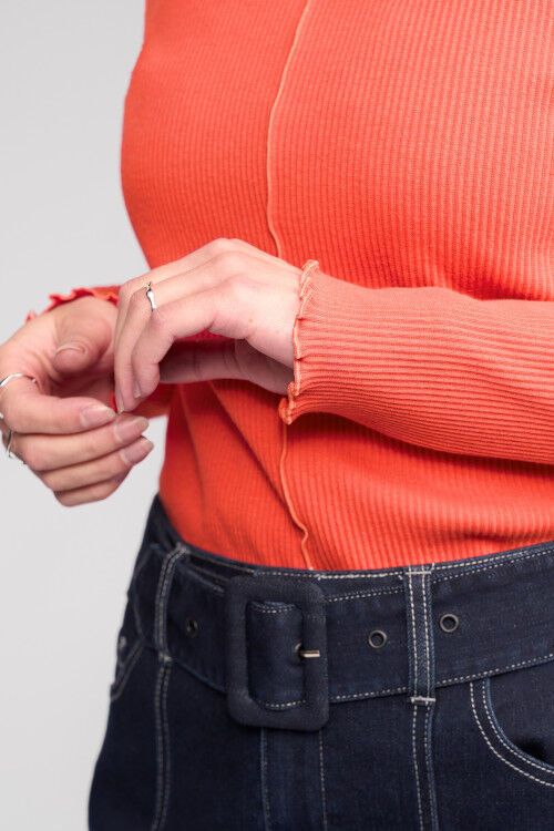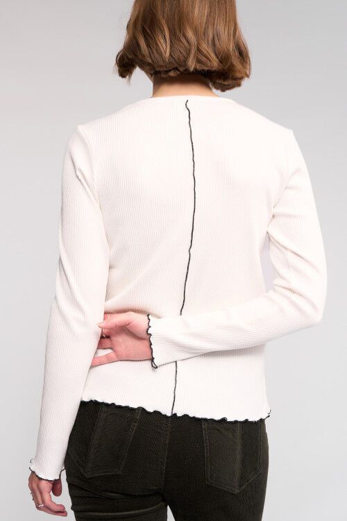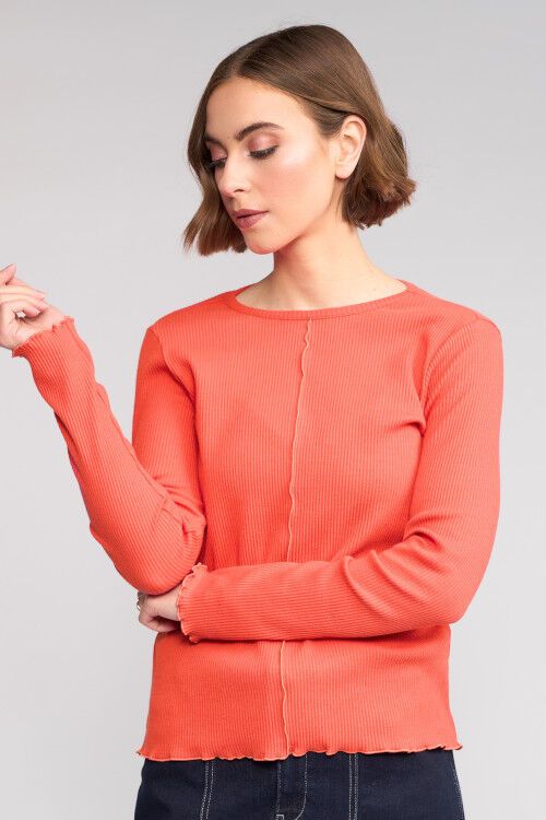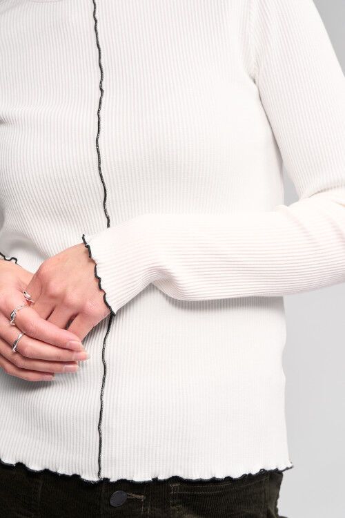 Long sleeve fine ribbed cotton top with elastane for stretch and comfort. Featuring a round neckline, this top is detailed with lettuce-edge seams along the hem and cuffs, as well as vertical decorative seams from neckline to hem at front and back.  95% cotton, 5% elastane