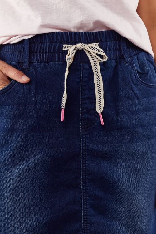 Above knee stretch denim skirt with elastic waist with heavy wash