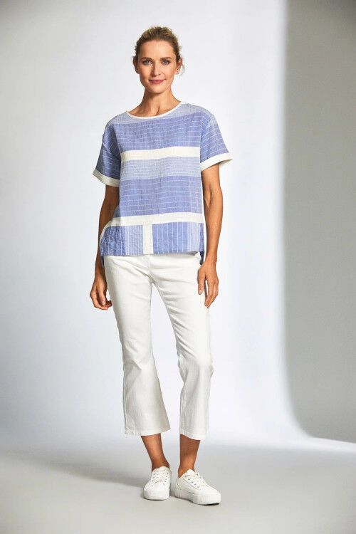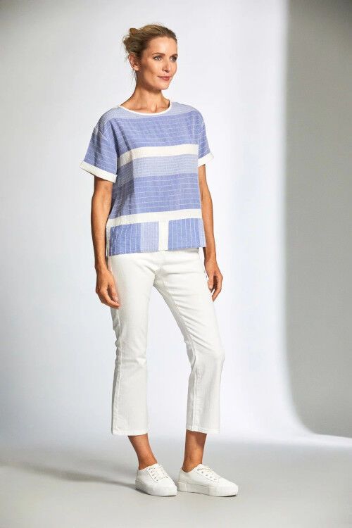 A very fresh looking top for summer featuring clever stitch stripe detail. Peruzzi is an Irish designed brand, made with Italian craftsmanship and quality fabrics. 68% viscose, 28% acrylic, 9% cotton, 5% linen