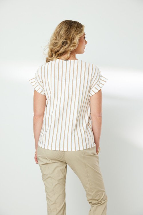 Cotton scoop neck stripe tee with tape trim detail at shoulder. Extended shoulder with fold up cuff.  Main: 100% cotton;  Trim: 90% cotton, 10% metalic fibres
