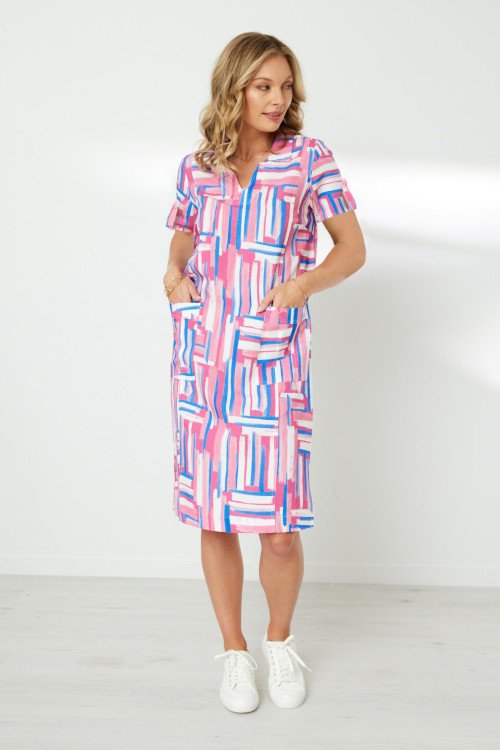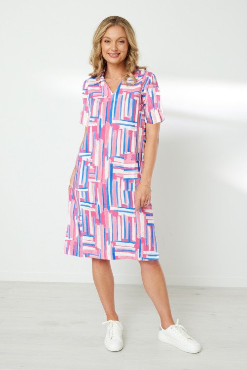 Printed shift shape dress with collar & notched neck. Patch pockets at front waist. Short sleeves with roll up tab to adjust sleeve length. Back yoke. Hem has side splits.  70% Lyocell, 30% linen