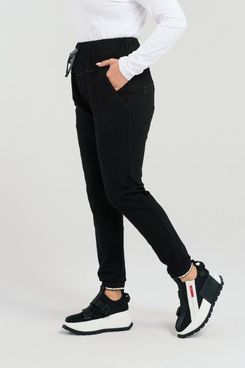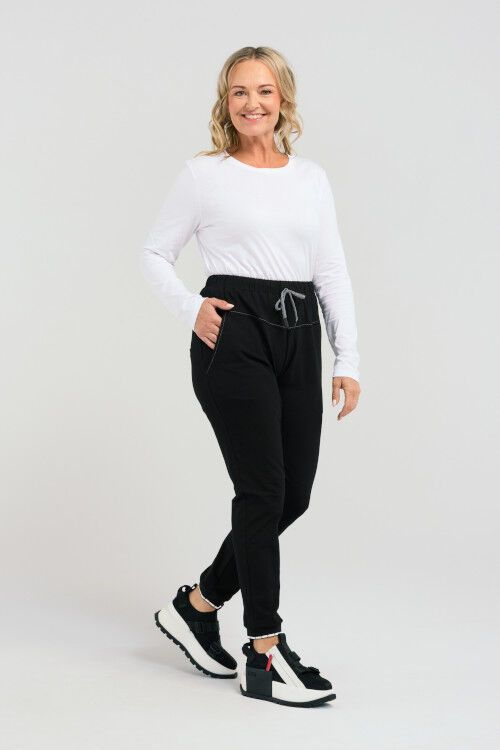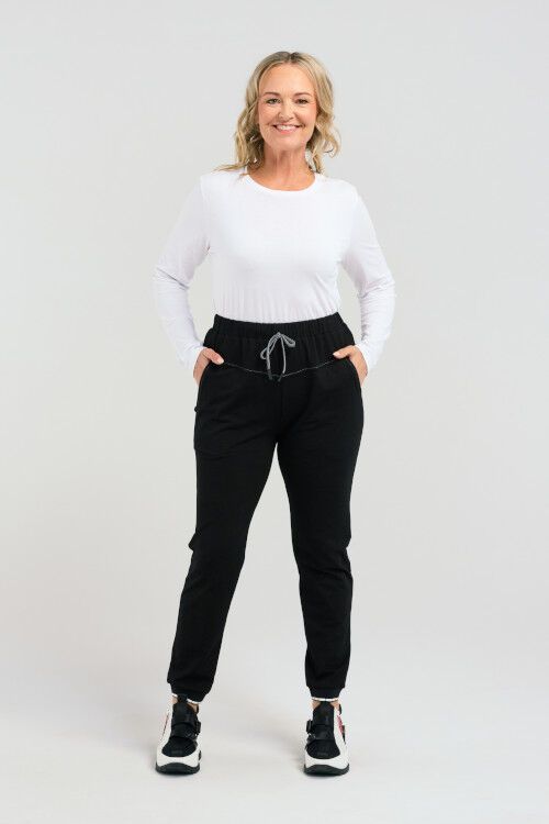 Experience comfort and style with these sweatpants featuring an elasticated tie waistband, waist panel detail, convenient drop pockets, and cuffed hems. A perfect blend of casual and chic for a relaxed yet fashionable look. 95% cotton, 5% spandex